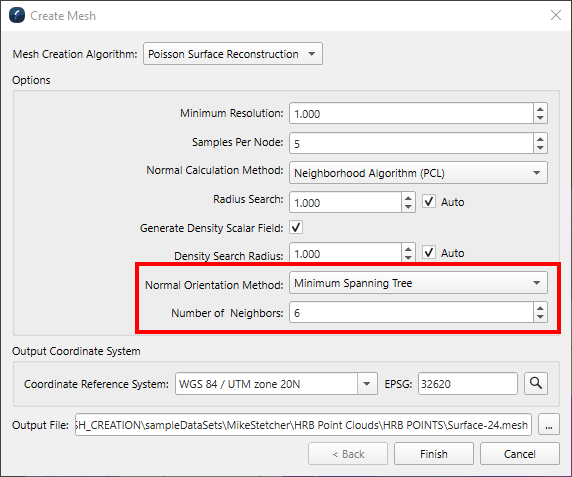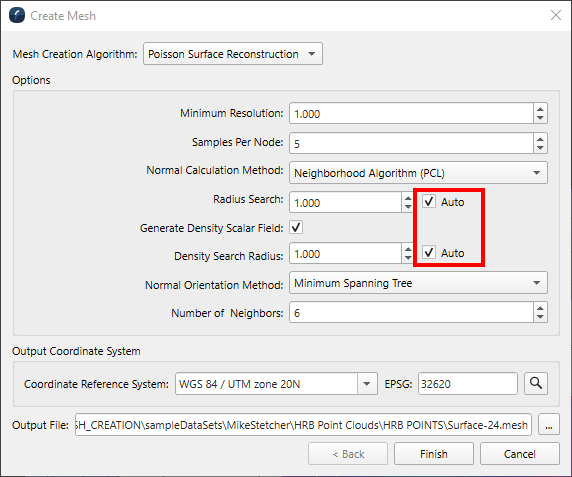 The construction of meshes revolves around the idea of creating vectors that point away perpendicularly from the point cloud, these are referred to as normal vectors, or "normals" for shorthand. The "Radius Search" for calculating point normals, as well as the "Density Search Radius", now have a new default "Auto" setting. When this is enabled, appropriate values will be calculated automatically during the creation process. You would only set these values manually in special circumstances or when trying to investigate a problem. More information on when to adjust these from the default setting can be found in the documentation.