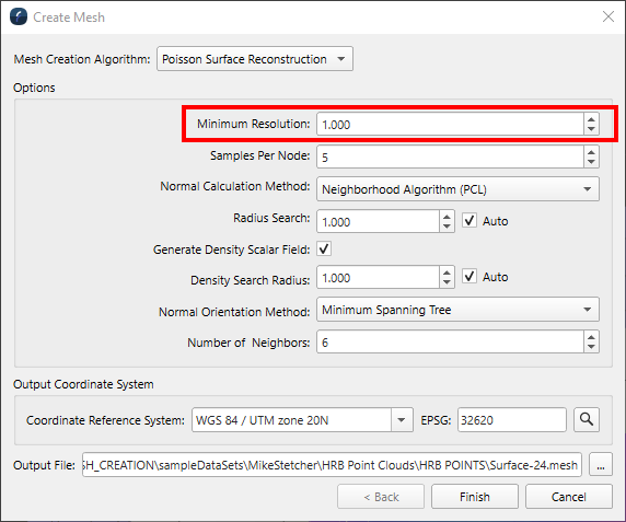 A primary goal for this release was to make mesh creation easier to use. A key part of this work was replacing the "Octree Depth" parameter with "Minimum Resolution". This is an easier parameter to work with since it deals directly with the concept of a spatial resolution of the desired end product, and brings the creation process closer to the same as building a grid. This value is used to specify the smallest triangular segment in the mesh being created. As this is a variable resolution structure, the mesh will only go to that minimum resolution in areas that the data supports it. In areas where point data is more sparse, the triangular facets will grow larger. As the mesh adjusts to the differing point distribution, the finest resolution will be limited by this new parameter.