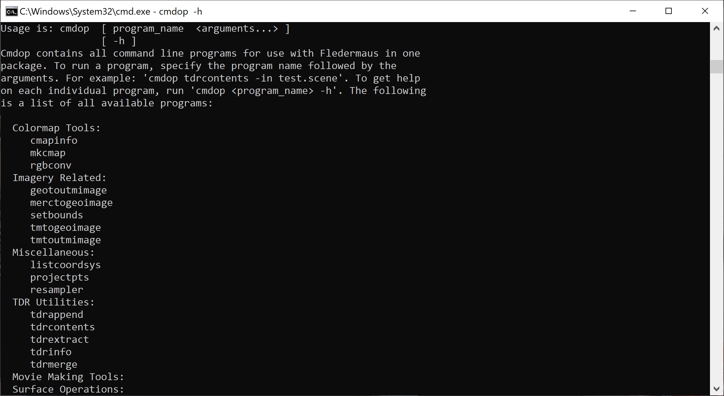 A new tool for scripting operations on the command line has been added to Fledermaus 8.3.0. This tool is an optimized version of the "cmdop" tool that Fledermaus 7 users may be familiar with. This tool allows common operations, such as importing and grid operations, to be run as part of script. By using a script to perform these operations, large numbers of files can be processed in batch.