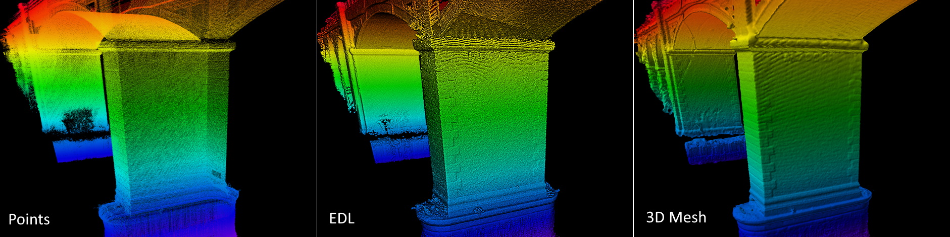 The EDL shading works very well in combination with the 3D mesh creation tools in Fledermaus. Using EDL you can get a quickly improve the depth perception and shape recognition within a point cloud, without having to wait for the creation of a 3D mesh. When further perception is needed, or quantitative analysis is required, a mesh can be created.