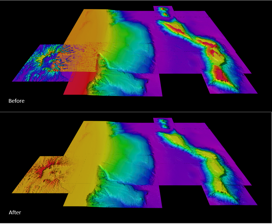 You can now adjust the visuals (colormap scheme and shading and illumination) of several surfaces at the same time, allowing you to adjust the colormap and range to the selected set of surfaces. Figure 1 shows several geographic surfaces, loaded one at a time, before adjustment, each one has its own colormap and then after adjustment.