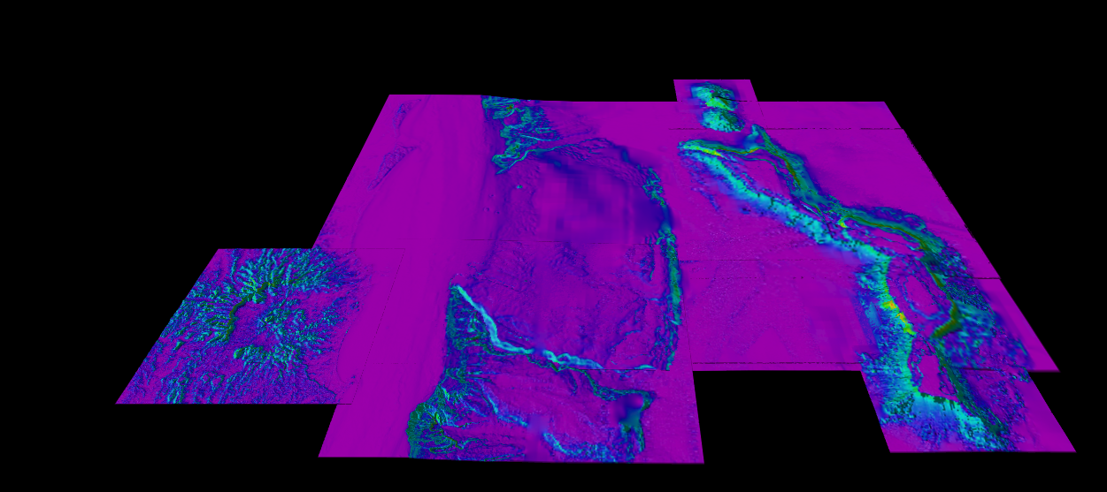 It is now possible to work with geographic datasets by resampling non-uniform cells, as original data is in degrees, as such datasets that are geographic will align better, and now load. This was a known limitation from the last feature release of 8.3.0. See Figure 6 the 4D Scene with with a scene composition of several geographic datasets on Fledermaus 8.