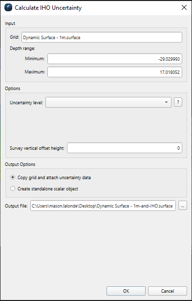 The Calculate IHO Uncertainty dialog calculates the uncertainty associated with the dataset. This uncertainty value will determine whether the data has met IHO order standards.