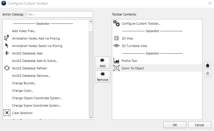The Add button will add the selected Action in the Action Catalog list to the Tool Bar Contents list.