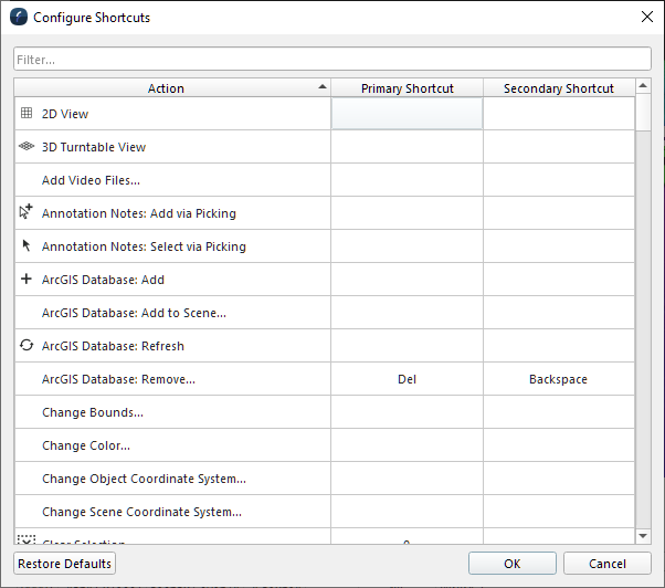 The Filter text field is used to search for a shortcut. Shortcuts can be found using their Action Name or Primary and Secondary Shortcut keys.