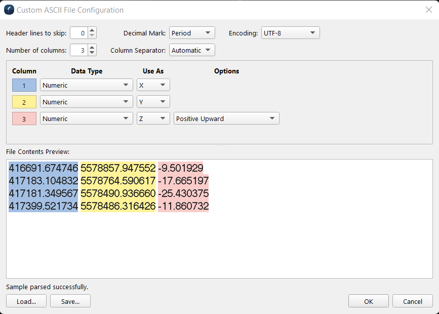 The options at the top let one tell the parser to skip some lines at the start of the file. Often ascii files have a single line identifying the column names of a file but you don't want to actually try and read these in so giving a skip value of one will ignore this line and read the data that follows. The Decimal Mark dropdown specifies which character represents the decimal point. It will default to a period but other options are a comma for example which is often used in Europe. Encoding defaults to UTM-8 which is the most common but UTF-16 encoded ascii files are also supported. The Number of columns field identifies how many fields per line will attempt to be parsed and it can be adjusted as appropriate for the input file. The space below adds a set of controls for each field to identify the data type, how it is used and some potential options or data modifiers. Finally the Column Separator indicates what character separate each field in a line. Normally the Automatic options works file to detect whitespace as a separator but for example if you have colon separated columns it can be specified here.