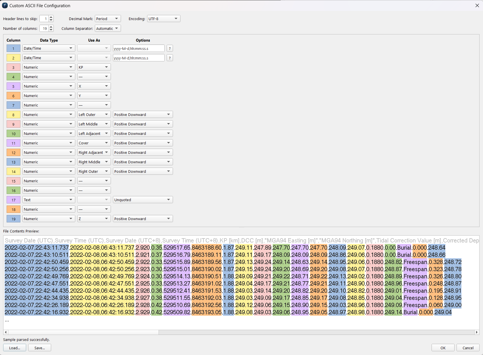 Numeric is a floating point number or values with decimals, Integer is well integers (no decimals), text is strings - things like labels, Date/Time is a field that represents a specific date and/or time component, and the degrees-minutes-second is used to identify a geo-spatial latitude or longitude value. Fields have an additional optional control. The numeric and integer field can be specified as positive up (the default) or positive down (depths for example). The date and time field lets you build up a description of how the date and time is present using a set of characters to indicate year, month, day, hours, minutes and seconds. There is help built into the option. See the example below as well. Finally there is the Use As field which indicates the purpose if any for the field. X, Y, and generally Z are always present to identify which field is those values. When parsing an ascii file the system will default to an assumed X, Y, Z style file and one can customize it as necessary from there. The actual options available for the Use As field depend on the purpose the parser is being used for. Importing general points has different options then importing a Cable/Pipe listing file. For example a Cable/Pipe listing file might look something like this example: