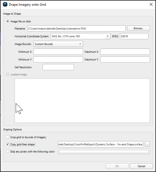 Select the image to drape on the surface. Either a file from disk, the upper option, or an object in the scene from the list under Loaded Objects. The image must be fully georeferenced, which is the case for Loaded Objects. Fro files from disk, full georeferencing must be specified. Any georeferencing in the file from disk will be filled in automatically. Some images do not have full georeferenicng, and this must be added before the image may be draped.