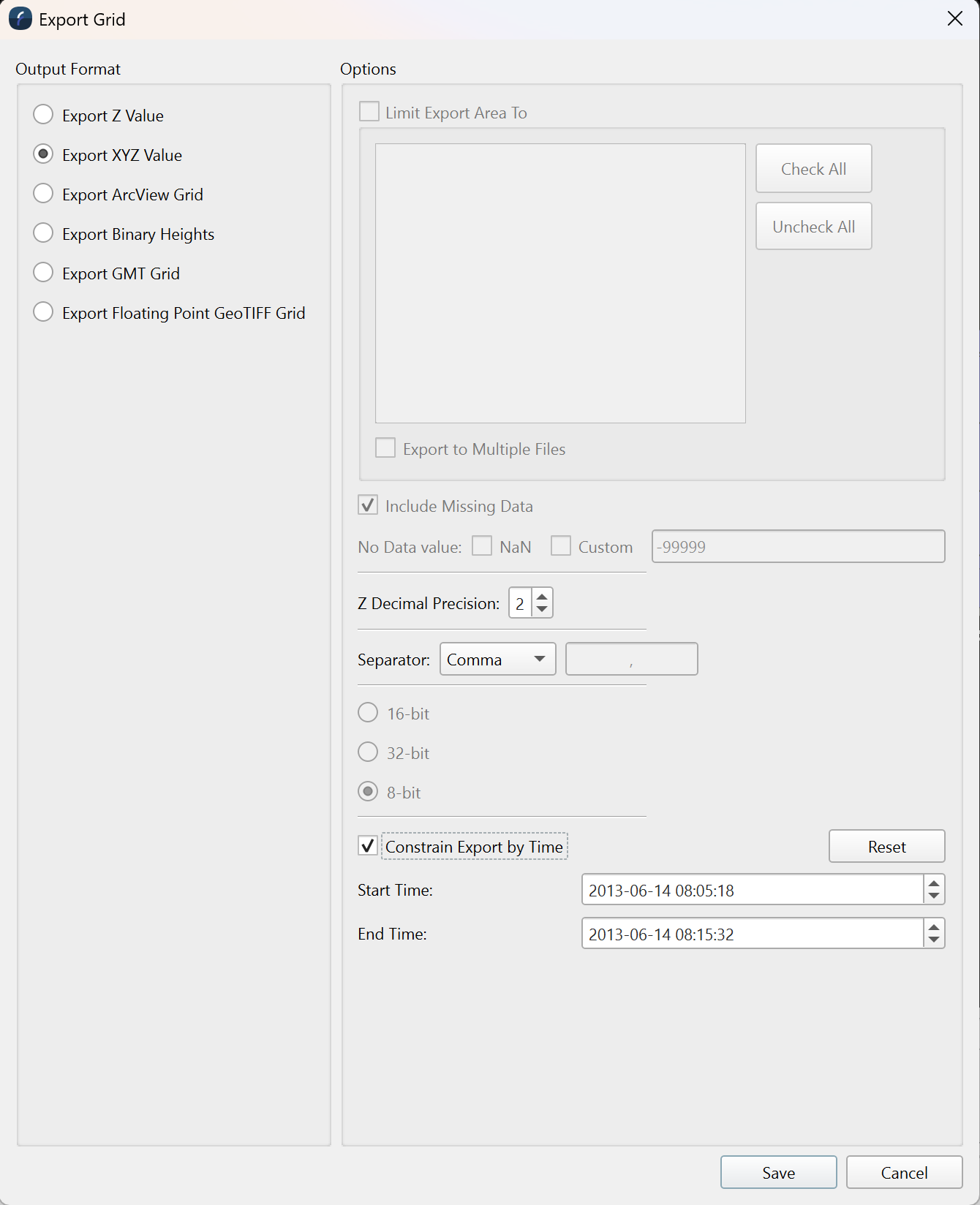 This option allows the current selected Surface to be exported to another supported surface. When saving the data, areas of the surface containing no data may be included with the output file if the Include Missing Data option is on. If missing data is included, a special value is written for these data points, indicated by the No Data Value text field. When writing a binary file, you may specify either writing an 8-bit or 16-bit number, or a 32-bit greyscale value containing red, green, blue, and alpha components. When exporting to ASCII X and XYZ Grids, there is an option to specify a decimal precision of the Z value being written. You may also include constraints by time for your exported grid. this will limit the grid to only the data collected between the 2 times