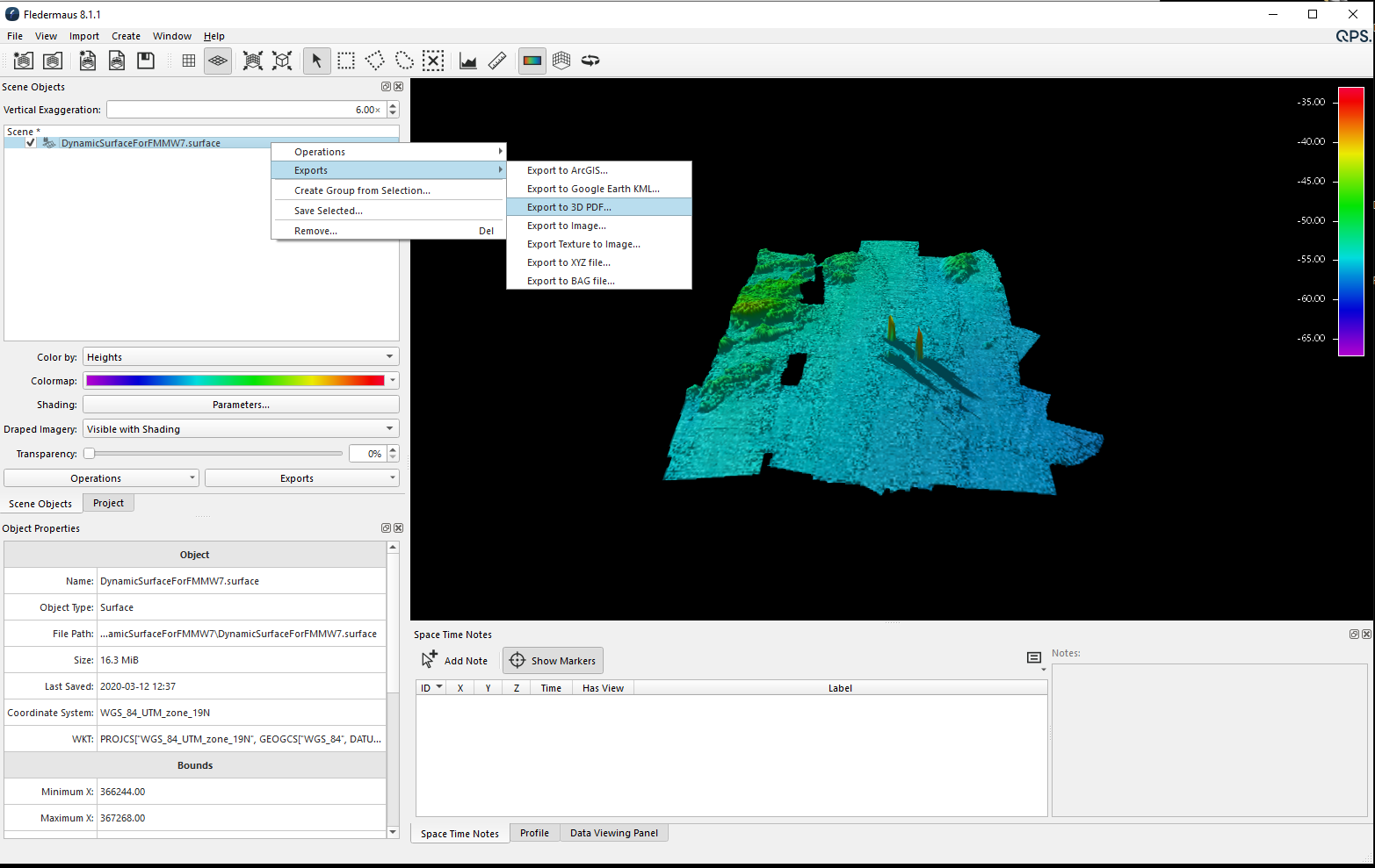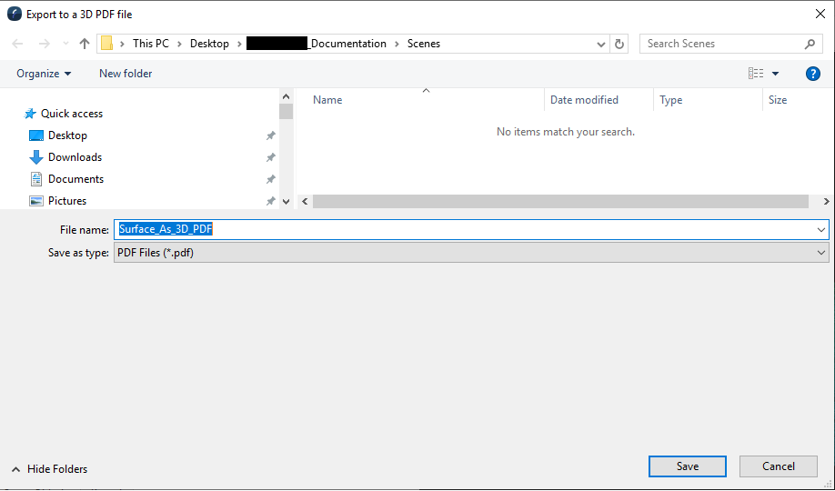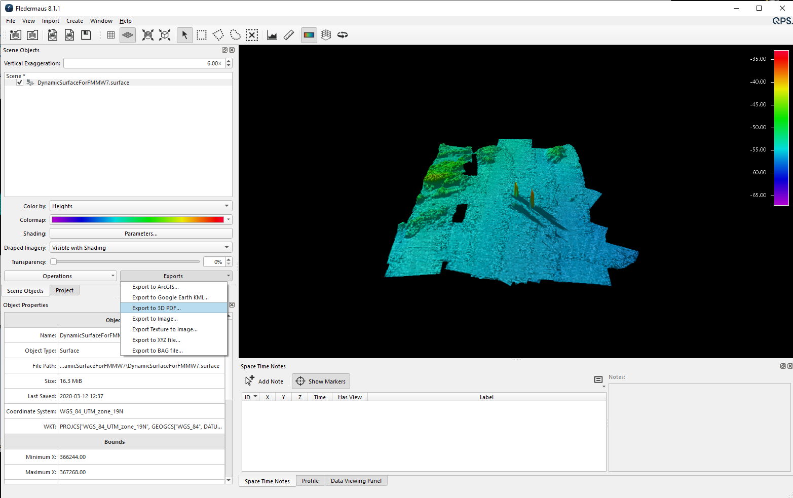 This feature is used to export the scene objects as a 3D PDF which can then be loaded in Adobe Acrobat Reader or other compatible 3D PDF readers. The scene's vertical exaggeration is used in the export.