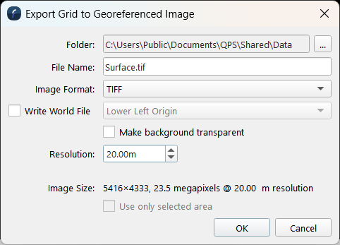 This dialog is used to save a georeferenced image file (TIFF, JPEG, PNG, BMP, TFW), of the surface.