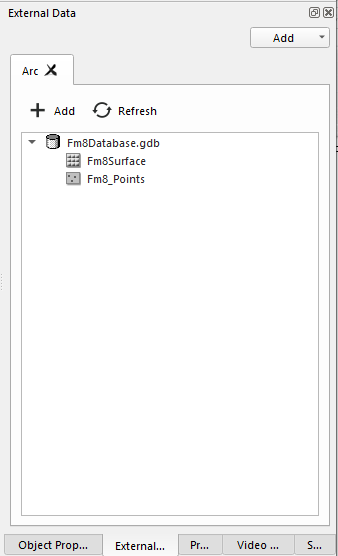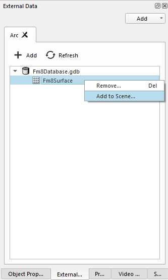 Using the Add Arc Geodatabase option will add an ArcGIS geodatabase connection tab to the External Data window. Once the Arc tab is added, you can connect to an exisiting ArcGIS geodatabase or create a new file or folder geodatabase using the Add button. The Refresh button will manually refresh the geodatabase connection to display the latest contents of the geodatabase. If you open a scene with a geodatabase, clicking the Refresh button will re-connect to the geodatabase.