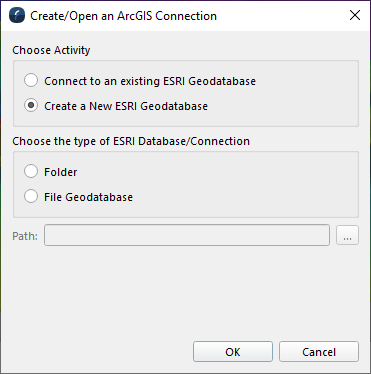 Clicking on the Add button will open the Create/Open an ArcGIS Connection window. There are options to Connect to an existing ESRI Geodatabase or Create a New ESRI Geodatabase. Select an option and then select the type of ESRI database connection, Folder and File Geodatabases are supported at this time. Finally select the Path and filename where the geodatabase is or will be stored. This will add the Geodatabase to the Arc window.