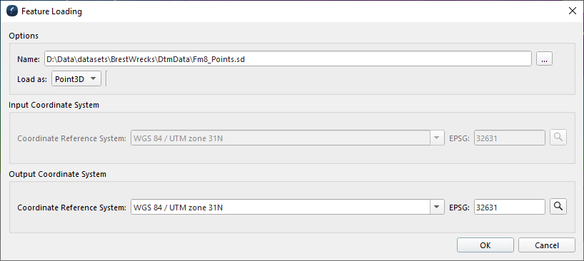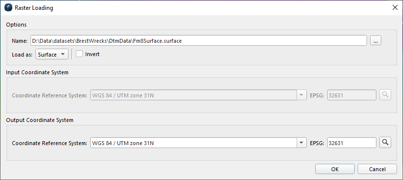Depending on the type of item you select in the Arc Geodatabase, you will have different options available for importing the object in the Options section. For example if importing a raster object, you can change the type in Fledermaus 8 using the Load as: drop-down menu. The output Coordinate System can also be changed here to match the Scene or Project.