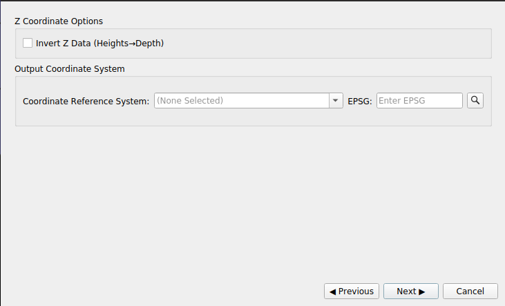 The output coordinate system can be selected here. Often, the same coordinate system used for input is used here, but it is possible to reproject data from the input coordinate system to a different one. This may be because the scene coordinate system used in Fledermaus is different from the input data. If the imported data does not have the same CRS as the scene, it will not display in Fledermaus. It is possible to reproject data to the scene CRS in Fledermaus later, if that is desired.