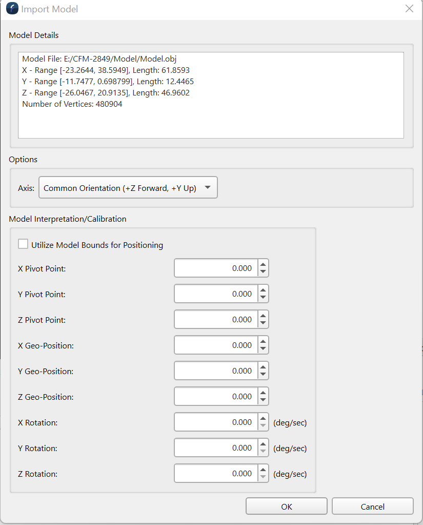 At the top of the dialog some basic information about the model file being read is shown. Most models are designed near the cartesian origin of (0.0, 0.0, 0.0) and the length of the model along each axis is shown. You can also see how many triangle vertices make up the model. The Axis option controls how the model is brought into the scene. Many models have a positive Z forward and positive Y up but some such as those that come for the common open source Blender applications have a positive Y forward and positive Z up axis configuration. The current axis options include: