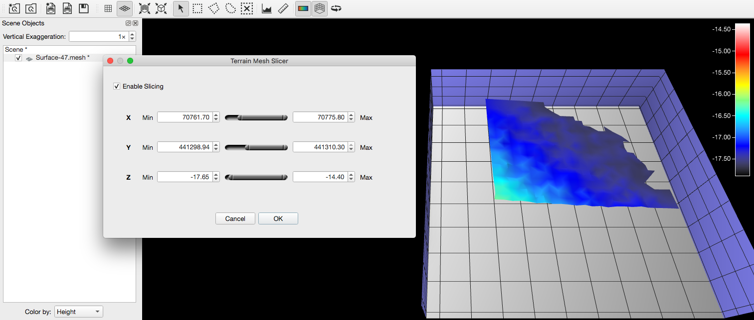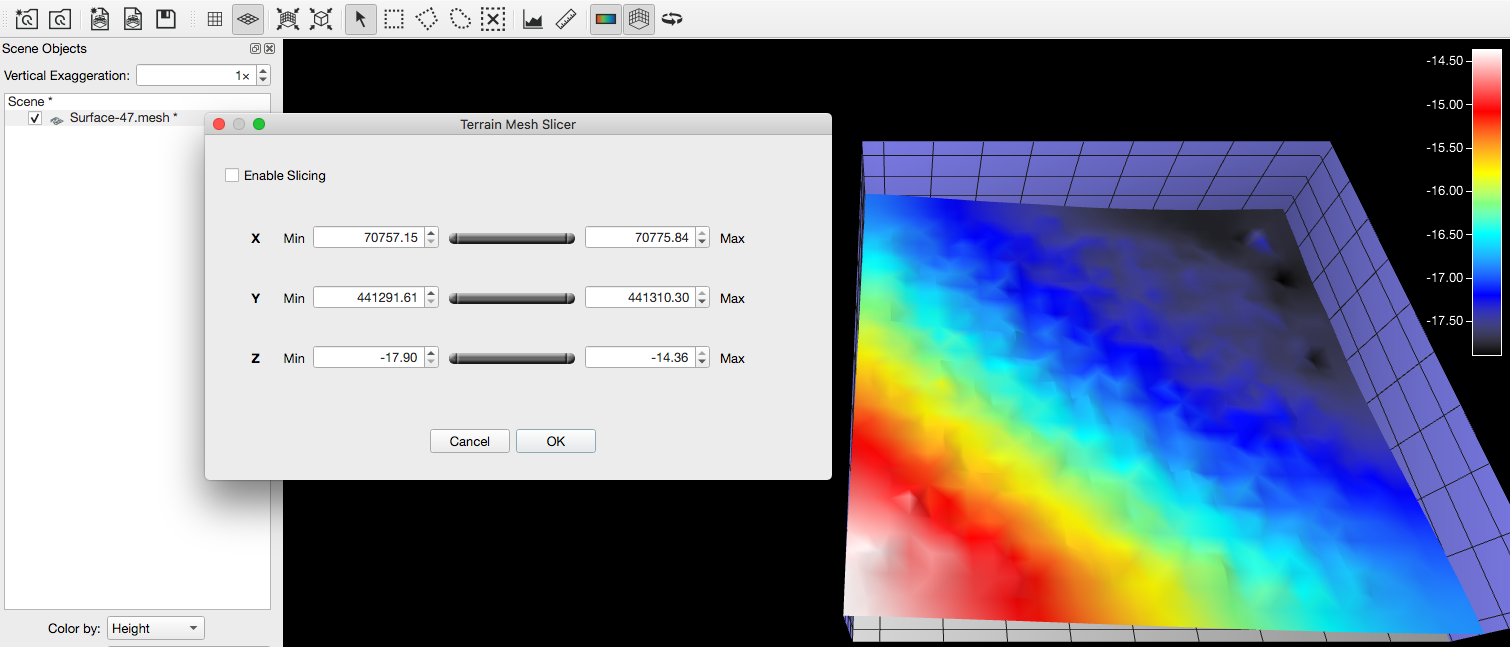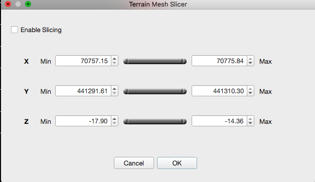 The Mesh Slicer dialog allows the user to slice the selected terrain mesh on X,Y and/or Z axis.