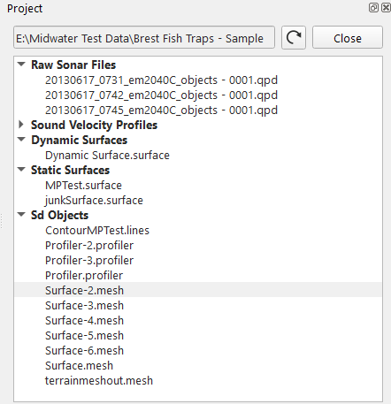 The Project Dock tab as shown in the figure above allows the user to interact with QPS Projects. The entry field at the top shows the current active project. The (recycle) button will re-read the project from disk and update the dock contents accordingly. The Close button will close the current project so it is not part of the current scene. When a project is loaded the rest of the dock will be filled in with the various project sections from raw data files to processed files in the project. When you right click on files different context menu options will be presented depending on the data type selected to perform actions on the selected files.