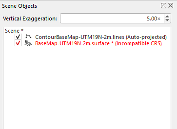 Certain object types such as lines and points can auto-project to match the scene's coordinate system. These types of objects will not display the red outline, since they will automatically re-project themselves into the scene's coordinate system. When this happens, the text "(Auto-projected)" is appended to the item in the scene tree. Auto-projected items still have full functionality, this is just to indicate that the object was created in a different coordinate system.