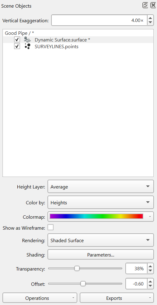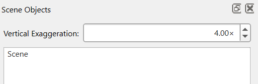 The Fledermaus scene represents all the objects which are loaded into the application for visualization in the 3D scene. These objects are listed in the Scene Control Dock which is described in detail via the link. It basically has three areas. A control for the overall scene vertical exaggeration at the top, the main area that shows the scene root and any loaded data objects accordingly to their hierarchy, and an area at the bottom which is used to display attributes for the selected objects. In this example for the selected surface. When multiple objects are selected any attributes all selected objects share will be shown in the attribute area. Thus you can change the attributes of many objects at once if desired. When any objects visual state is modified from how it is saved on disk you will see an asterisk (*) at the end of the file name to indicate that if you want the change to be preserved you need to save the object. If any object or scene attribute is changed then the Root object for the scene called "Good Pipe" in this example will have the asterisk beside it noting the scene needs to be saved if you want to preserve the overall state of the scene. When you have a new empty scene the control looks like below to the parent of the overall scene titled "Scene" until one decides to save the scene.