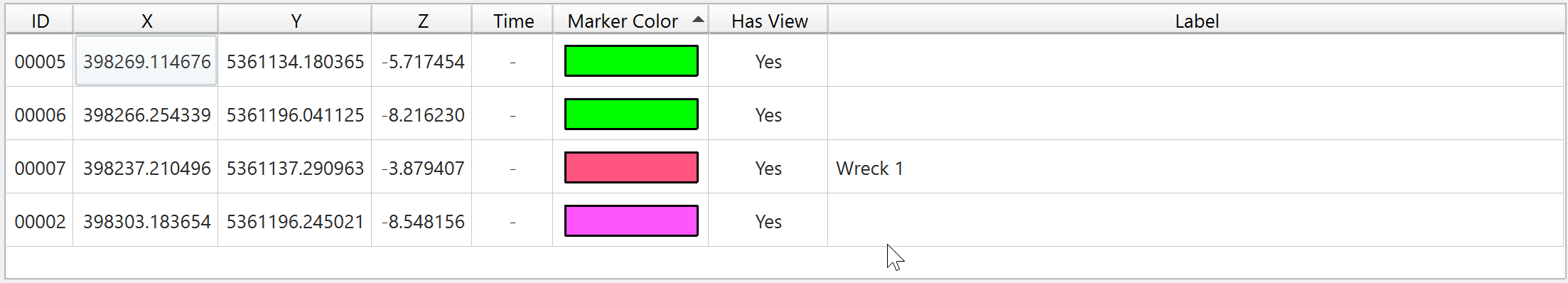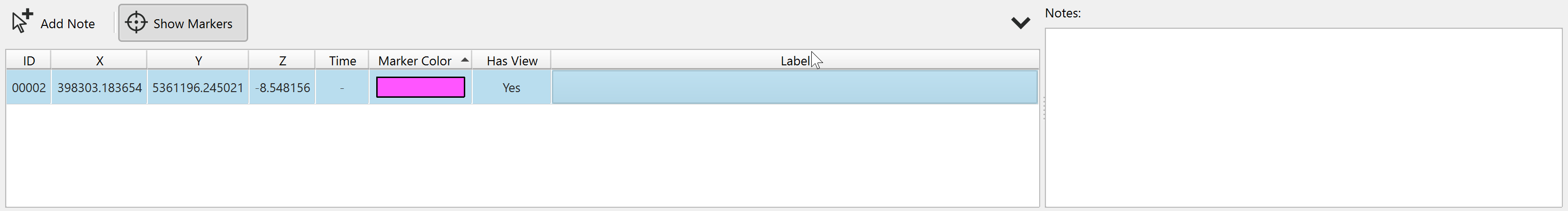 The table will display all the notes in the scene, with their ID, position, time (if applicable), marker color, whether there is an associated view and the label. If there is a label included this will also be displayed on the surface.