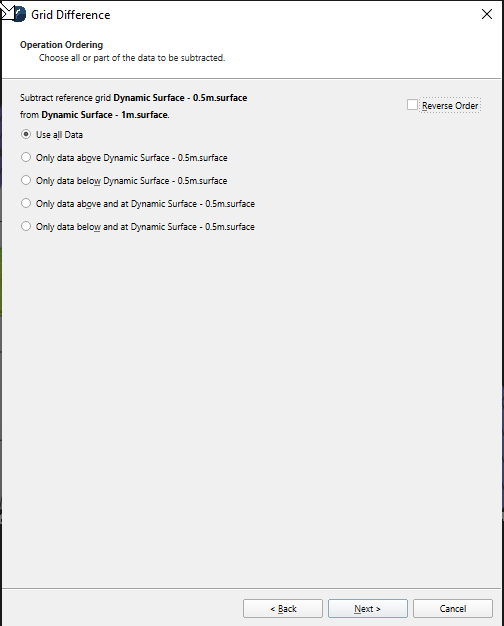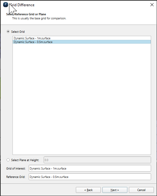 for the difference operation. Alternatively you can choose to use a plane at a specified height for the second surface. Click Next to proceed to the next page, Back to return to the previous page of the wizard or Cancel to cancel the operation.