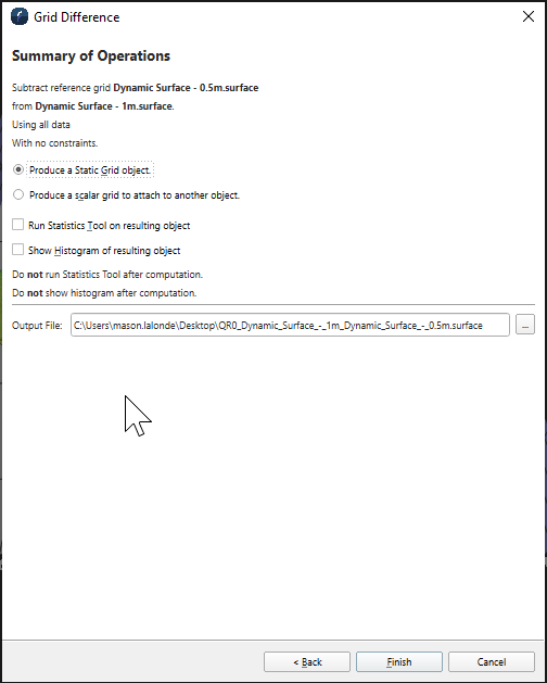 Review the selected options for the difference operation. Click Finish to proceed or Cancel cancel the operation. When complete, a Fledermaus static surface will be added to the project representing the results of the surface difference operation. Assuming they are selected one will also see the statistics for the surface difference and/or a resulting histogram of the difference.