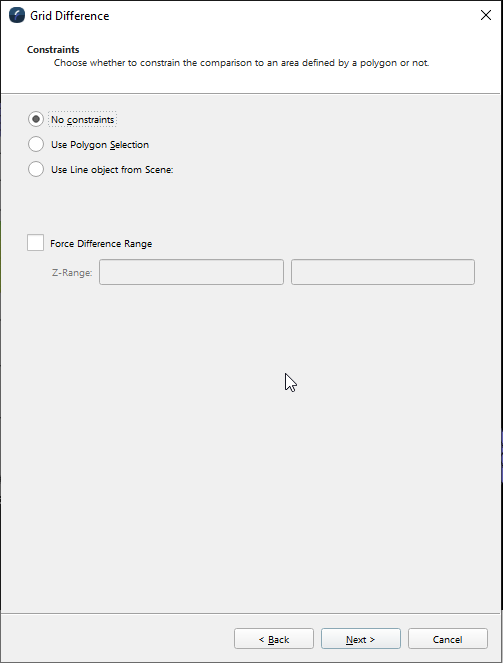 Select the constraints of the difference operation. You can optionally specify a Z-Range that you want to force the difference surface to have. The main purpose of this is you want to do multiple surface differences one can optionally guarantee each resulting surface has the same difference range which is particularly useful if one wants to show the difference histogram in the next page to make comparative histogram plots. If one chooses to force the difference range any resulting difference cells outside the specified range will be clipped out. Click Next to proceed to the next page, Back to return to the previous page of the wizard or Cancel to cancel the operation.