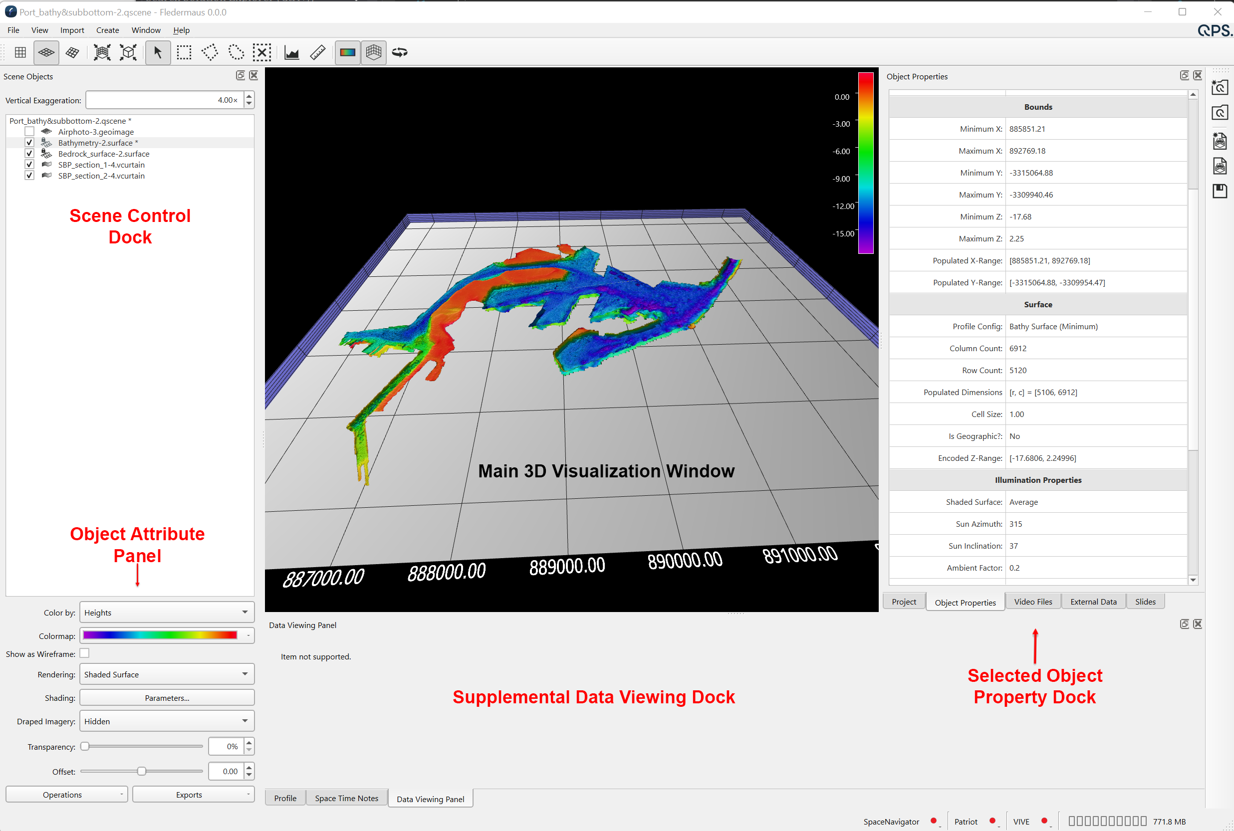 Fledermaus supports many different types of objects which can be loaded for visualization and analysis. When an object file is loaded it is added to the scene object dock. Each object has a visual presentation in the main display, properties that show up in the properties dock, attributes in the attributes panel that affect how the object is displayed, right click operations that can be done on the object, and right click export options if the object supports any exports. Finally there is also a data viewing panel which for some objects shows a window of textual information related to the object's internal data. For example for point cloud objects it shows the actual point data information.