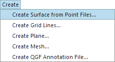 Using the Create Menu, select the Create Surface from Point Files as shown in Figure 2. For more information on the Create menu, please refer to the Create Menu.