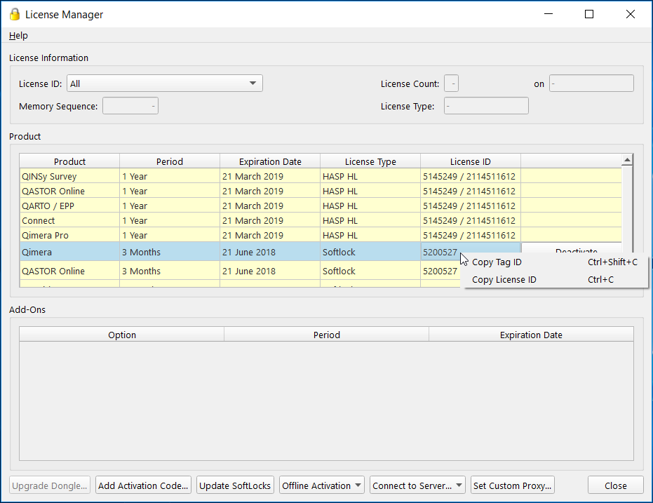 QPS applications currently support Softlock and HASP Dongle licenses that are fully integrated into the License Status Dialog.