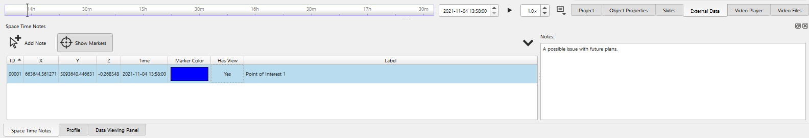 Once the Space Time Note has been made it is automatically given an unique ID, and the XYZ Time coordinates are recorded along with the time chosen in the time bar (see Figure 3). There are multiple parts of a Space Time Note that can be specialized like the Label, Color, Note, and View, they can be specialized by double clicking on them in the Space Time Notes dock. You can also double click on the space time note to move to it's saved view.