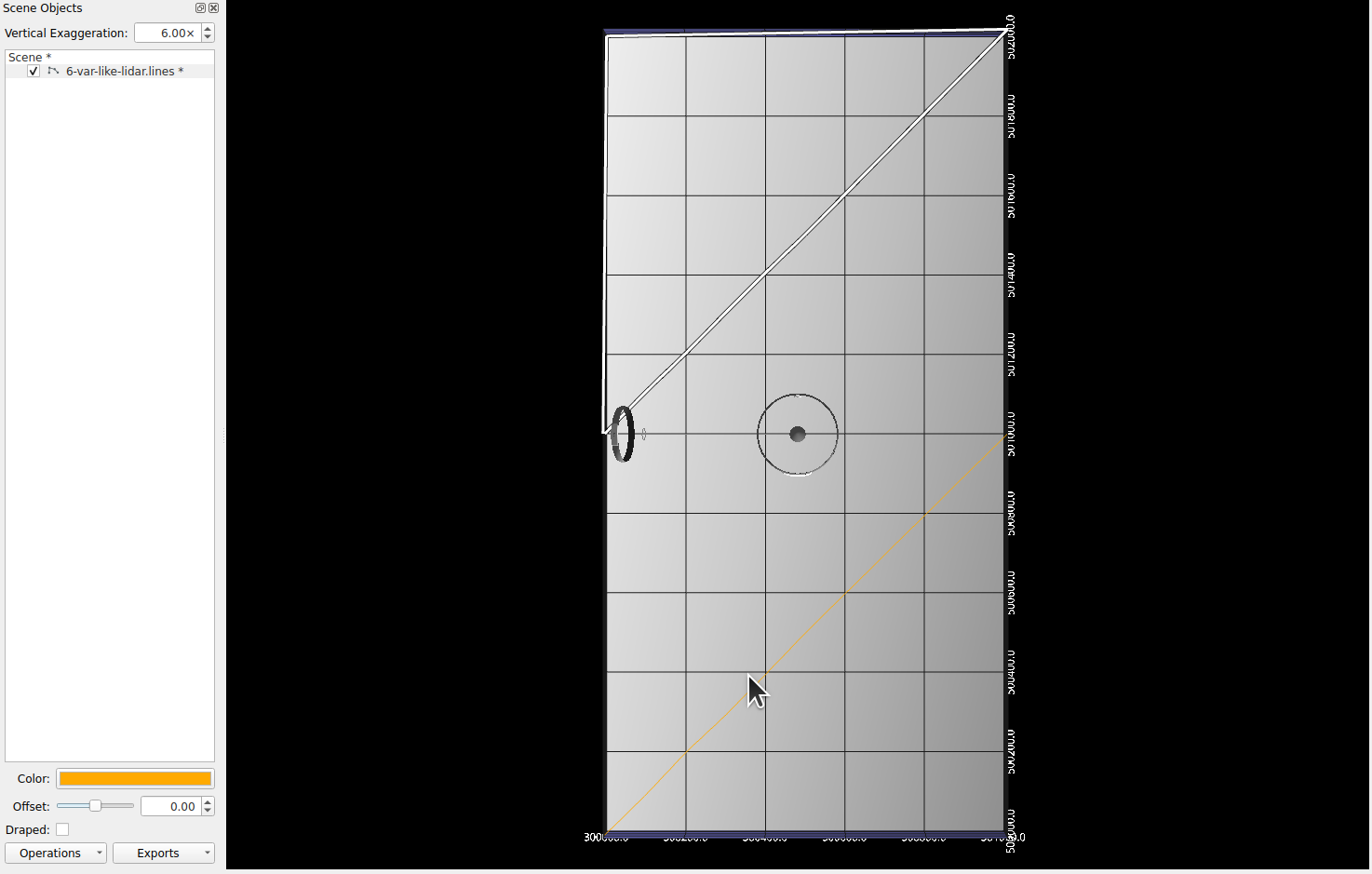 Example of a selected line. There are two lines in the scene. The upper, triangular shaped line is selected and is shown in selected mode. The lower, slanted line is in orange. Both lines are orange, as can be seen in the line properties panel in the lower left, however the selected line shows the selection mode marking.
