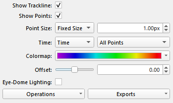 Given this is a survey points format we generally have a track line for the ship or survey vehicle which is shown by default as you can see in the example above. The system will also know the time range over which the data was collected and as you move the Fledermaus Time Bar to different times one can see a red dot plotted on the track line to show the vehicle's position at that point in time. The Show Trackline toggles lets one turn this track line off or on in the display.