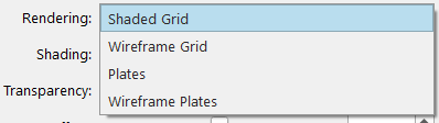 The Rendering dropdown is used to control how the Grid is displayed. The default is the Shaded Grid option which rendering the grid from cell center to cell center smoothly blending the colors across the Grid. The Wireframe Grid is the same as the Shaded Grid but doesn't fill in the triangles so you can see the surface as a wireframe. The Plates and Wireframe Plates are similar but they render each grid cell as a disjoint plate from edge to edge so you see the exact grid cell coverage and structure/size of the grid cell elements.