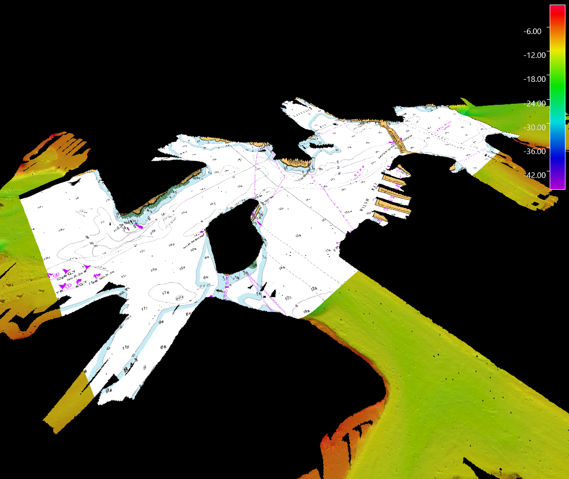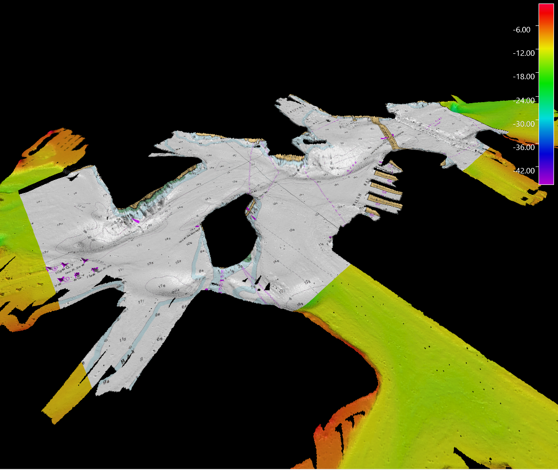 Grids are one of the primary object types in Fledermaus and are used to represent uniformly gridded surfaces. For example, a surface that represents Z = f(x, y) where x and y are sampled on a uniform grid. Grids in Fledermaus are dynamically streamed from the .statgrid/.dyngrid file. If the Grid is small it may be fully loaded in memory but for larger Grids more data is pulled in as you zoom in and move around the scene. The Grid object type in Fledermaus supports both Static and Dynamic Grids, although not all the features associated with Dynamic Grids in Qimera are supported. As of Fledermaus version 8.7.0 multilayer grids are now supported. Previously you could only have either a surface or a surface with an attached scalar layer. You can now have an arbitrary number of surface and scalar layers in a single grid object. All of the surface layers must have the same base resolution of the Grid. A single optional texture layer can be associated with the surface and have a different (usually higher) resolution.