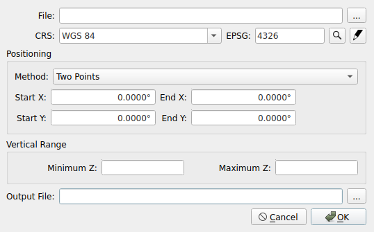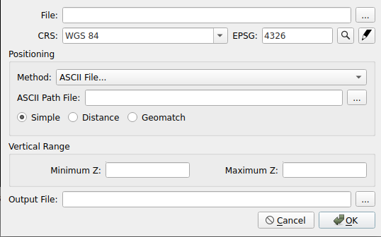 A vertical curtain or vertical image requires specific inputs on importing the image. There are two options, specified by the method option in the dialog, under Positioning. The first method is the Two Points method, whereby two coordinates in the XY plane are specified. The image is then evenly distributed in the vertical orientation between the coordinates along the image. The second method is the ASCII File method, where a file is read and applied according one of the three methods listed: Simple, Distance or Geomatch. See below for a discussion of the ASCII File method.