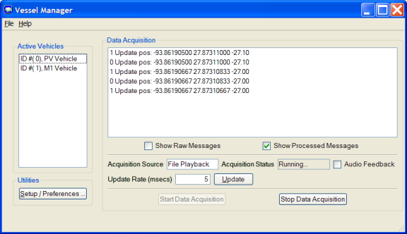 The vessel management tool is designed to support remote operated vehicle operations, vessel tracking and other similar real-time tracking tasks. It serves to gather the realtime data from appropriate sources and present it to Fledermaus so that vessels, ROVs, and other moving objects can be tracked, measured, and analyzed. At its core, Vessel Manager understands standard NMEA strings, a special customized NMEA like data string, and the PLO (a US Navy) format. Data in any of these formats can be read in via a file, a serial port connection, or via network UDP packets. Previous versions of Vessel Manager could only support one vehicle when using standard NMEA data however as of version 6.5.1 multiple vehicles are supported based on the first two characters of the NMEA message strings. The VesselManager Application Window below is the display when the application is started. The main display area is used to verify that the input navigation is being successfully read and processed. The area to the left shows the list of active vehicles configured to receive data.