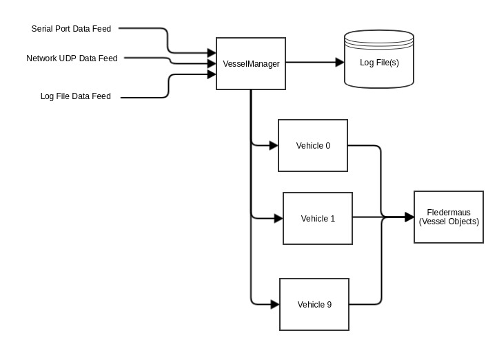 Setting up the workflow for vessel manager is a three step process. Configure the method of data input, specify its format, and setup the vehicle list. The basic data flow for working with real time navigation data is shown in VesselManager Data Flow figure below.