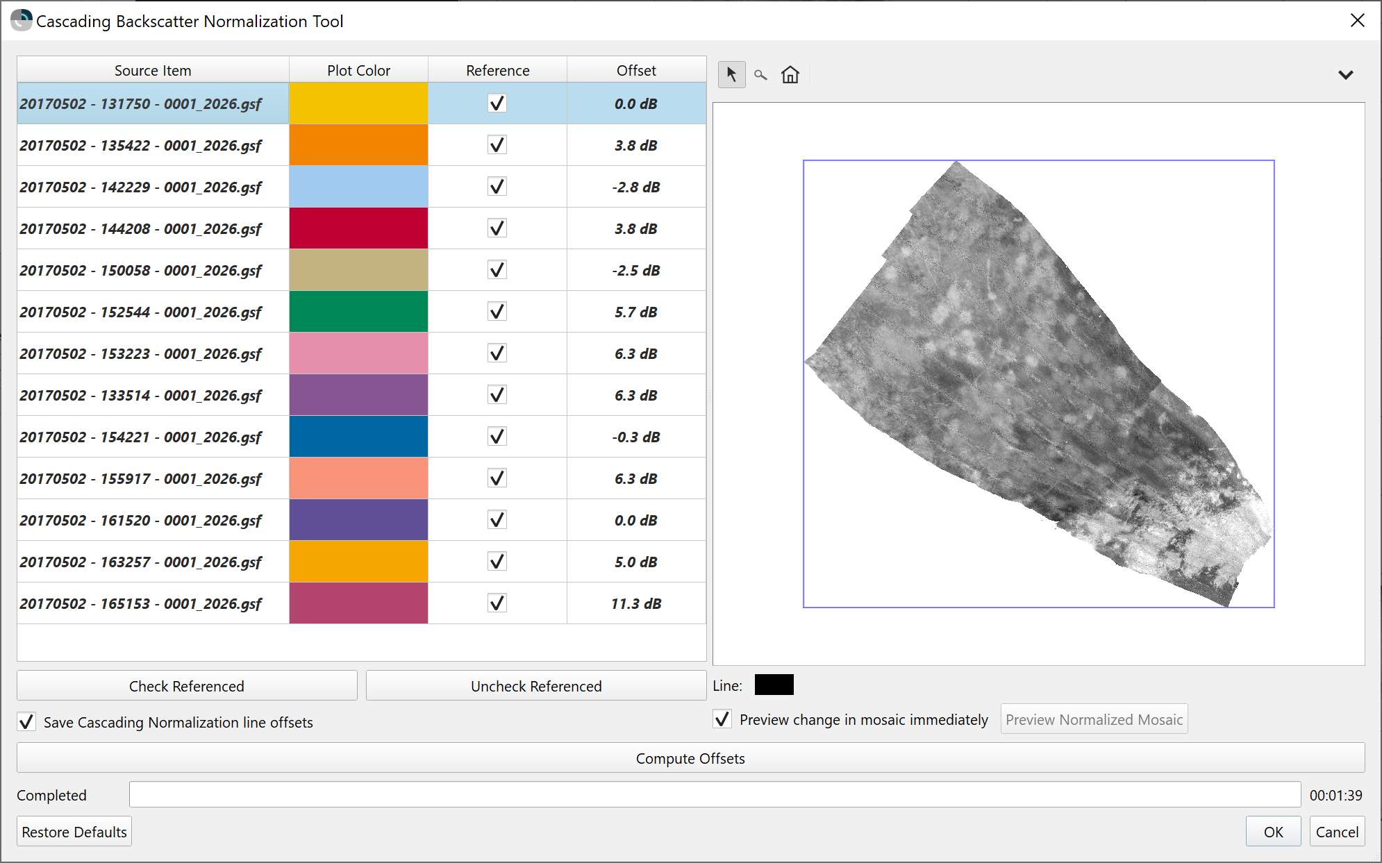 There is also now a new setting in the Mosaic menu that allows the user to choose to use the line dB offset results in mosaicing or not. By default, it is off, but it is enabled once the user uses either the new Cascading Backscatter Normalization Tool or the Line Backscatter Adjustment tool.