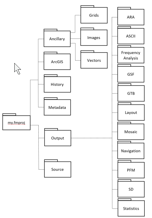 Once the project is created, a hierarchy of folders will be created as shown in the Project Hierarchy figure below. The primary folder at the top of the hierarchy will also contain the fmproject.xml file. This XML file is a common structure that can be used by FMGT, FMMidwater and DMagic to load projects. The key folders for FMGT are under the Output folder and are used to store the interim data created by the staged processing.