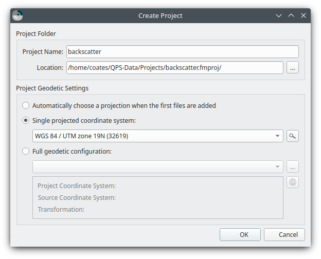 This section specifies the geodetic configuration of the project. Every project has a projected coordinate reference system (CRS) describing all the data inside the project. While data may be imported from or exported to other coordinate systems, the project coordinate system will be used as the CRS for data storage and processing.