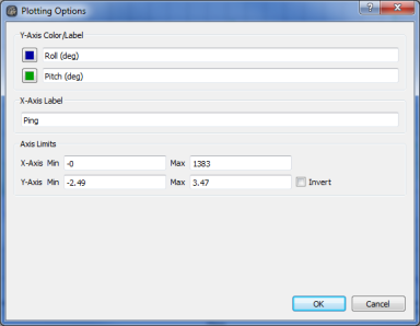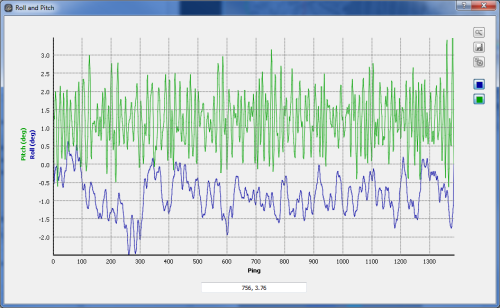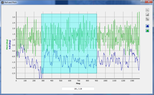 All plotting widgets have the same capabilities. The plot widget for roll and pitch of a selected file is shown in the Plot Widget figure. As you move your cursor over the plotting area, the cursor location values update in the text box at the bottom of the widget.