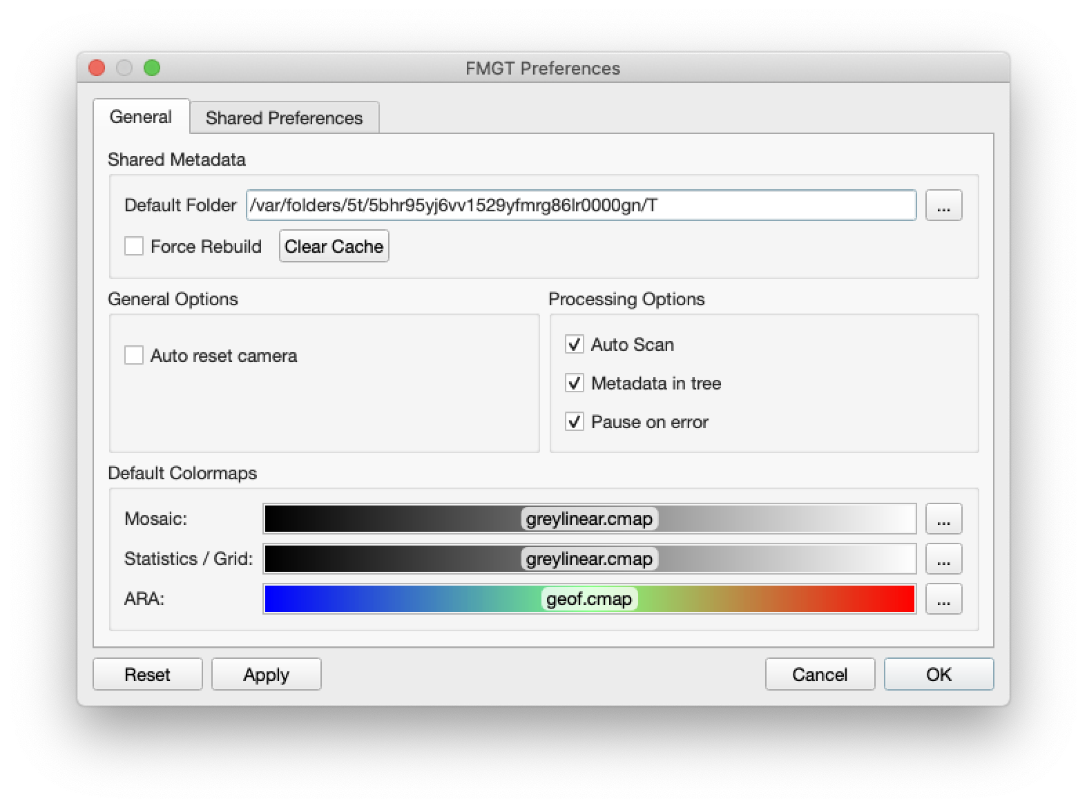 The Default Folder options allow you to change the location for FMGT index files to be written. These files are shared by both FMGT and FMMidwater. They are only created once unless the contents of the file change, which FMGT will detect.