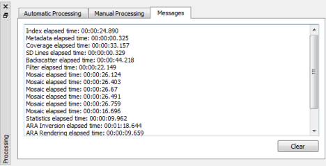 The Messages Tab will display all processing messages as well as warnings and errors that occurred during any processing stage as shown in the Messages Tab figure. You can clear this list by clicking on the Clear button. At this time, FMGT does not persist this data between project sessions. If want to save it, you will need to copy and paste it into a text document.