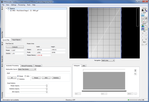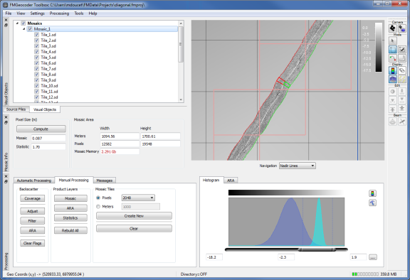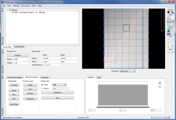 FMGT's rendering engine will use the tile layout, survey bounds or area selection as the target for all mosaic output. Statistics and ARA surfaces cannot be tiled. They will always use either the survey bounds or the current selection area. Typically, the larger resolution of these surfaces precludes their need for tiling. If FMGT cannot allocate a statistics or ARA surface, you must change the resolution until FMGT can properly allocate the surface.