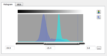 The Histogram Tab contains the Histogram Control shown in the Histogram Control figure, which displays the data histogram for any of the selected visual layers. The left and right text boxes show the currently selected range of the data. The center text box shows the value of the data for the current cursor location when over the control. To change the range, use the composite control by click-dragging on either end, or simply left or right click in the display to set the minimum and maximum desired value.
