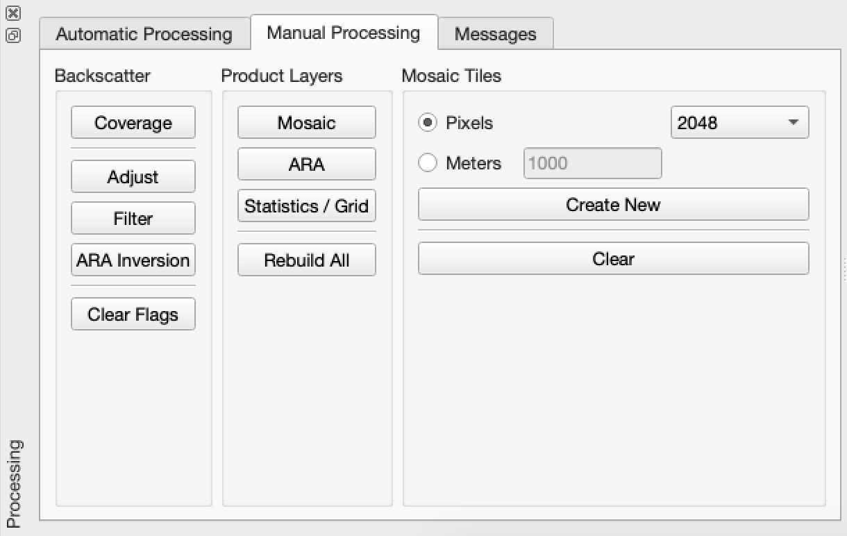 The Processing Panel of FMGT is the primary control over all processing of the user source data. It is divided into Automatic and Manual processing. Automatic processing requires the least user interaction as it runs all stages of backscatter processing through generation of specific output layers. Manual processing provides the user with finer control of specific processing stages of FMGT. Both of these paths are defined in detail in the following sections.