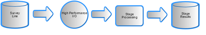 FMGT uses our internal high-performance I/O library to maximize reading of survey data from disk to achieve near theoretical maximum throughput. Results of a processing stage are persisted in the user project to further eliminate the need for re-processing when something in the project changes. FMGT then further increases overall performance by parallelizing this stage processing architecture as shown in the Parallel Stage Processing figure.