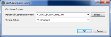 The Project Coordinate System dialog shown in the Project Coordinate System figure below allows you to view or edit the project coordinate system. If you change the coordinate system, you must re-process all of your data starting with the Coverage portion of the pipeline using the Manual Processing part of the main GUI. See the Manual Processing Tab section for information on manual re-processing of data.
